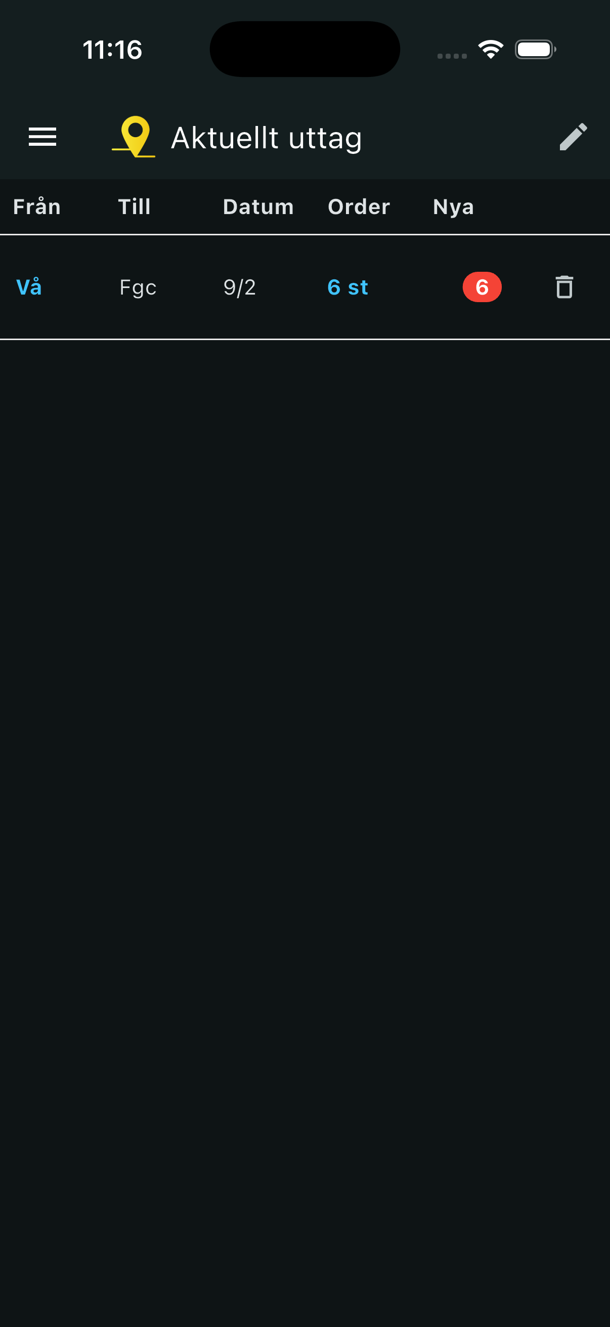 Körorder på surfplatta, i stående format. Bläddra mellan olika ordrar med hjälp av svepgester. Huset tar dig tillbaka till Aktuellt uttag.