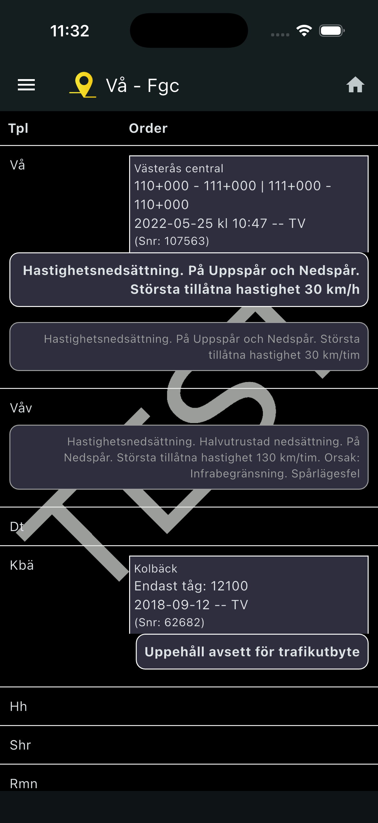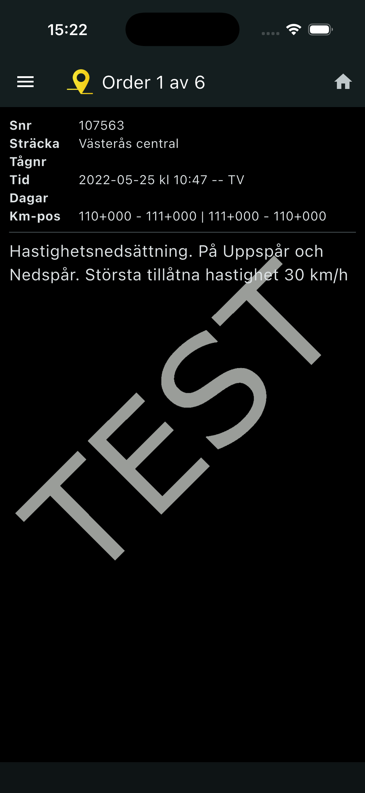- Speciell orderinfo som gäller för en viss plats eller sträcka, som hastighetsnedsättningar etc samt säkerhetsordernummer